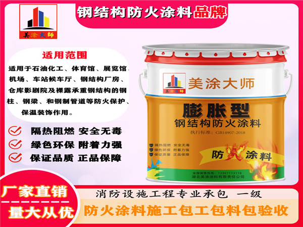 室外超薄型钢结构蓬安防火涂料是一种由复合材料、阻燃材料、防火填料等组成,并选用最新型的阻燃剂、发泡、发炭、催化剂等加工而成的新型蓬安防火涂料。该涂料涂层薄、用量少、耐火时间长,粘结力强,耐候、抗冲击、耐冻融性好。并具有较好的耐化工大气腐蚀性,涂层遇火时迅速膨胀增厚,形成发泡致密、均匀的隔热层,延长了耐火时间,从而达到防火保护作用。耐火时间根据等级不同可达0.50 h -2.00 h不等。